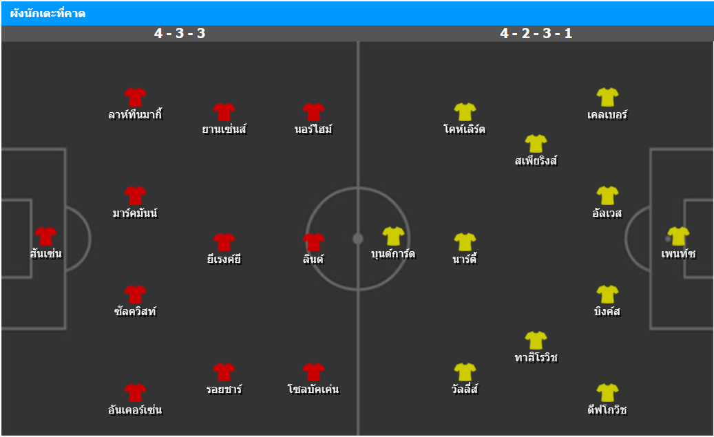 เกมนี้น่าจะมาในระบบ 4-2-3-1 โดยมี ฟิลิป บุนด์การ์ด ยืนหน้าเป้า และใช้สามแนวรุกคอยสนับสนุนได้แก่ มัตส์ โคห์เลิร์ต, โนอาห์ นาร์ตี้ และ นิโคไล วัลลี่ส์