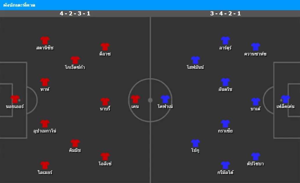 เลเวอร์คูเซ่น แม้จะกลับมามีฟอร์มดี แต่การมาเยือนอัลลิอันซ์ อารีน่า ถือว่าเป็นงานยากที่สุดเกมหนึ่งของซีซั่น ทีมของ ฮูลมันด์ จะเน้นตั้งรับและใช้จังหวะสวนกลับผ่าน ฟริมปง และ เวิร์ตซ์ เพื่อหาช่องโจมตี แต่ต้องระวังพื้นที่ว่างด้านหลังที่บาเยิร์นสามารถใช้ความเร็วเล่นงานได้ทันที