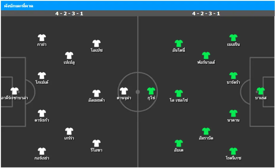 เรอัล เบติส (4-2-3-1): อัลบาโร่ บาเยส – เอคตอร์ เบเยริน, มาร์ก บาร์ตร้า, นาตาน แบร์นาร์โด้ เดอ ซูซ่า, ริคาร์โด้ โรดรีเกซ – ปาโบล ฟอร์นาลส์, โซฟียาน อัมราบัต – อันโตนี่, โจวานี่ โล เซลโซ่, อับเด เอซซาลซูลี่ – กูโช่ เอร์นานเดซ