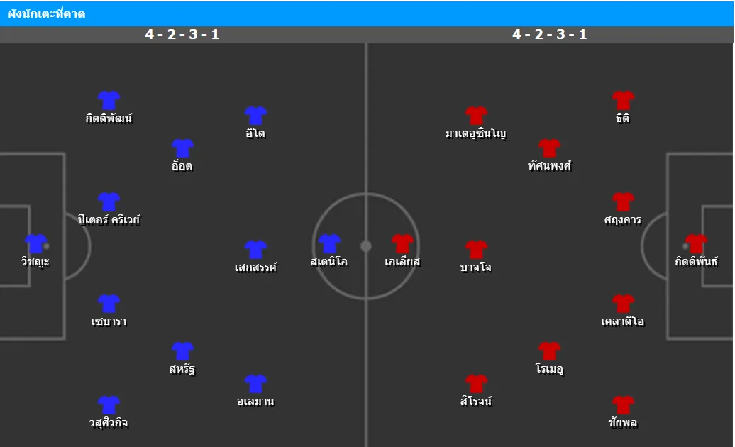 น่าจะใช้ระบบ 4-2-3-1 เช่นเดียวกัน โดยมี เอเลียส เป็นหน้าเป้า และ สิโรจน์ ฉัตรทอง, จอห์น บาจโจ ทำเกมรุก