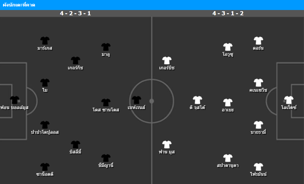 เกมนี้คาดว่าจะจัดทัพในระบบ 4-2-3-1 ใช้ เควิน เบห์เรนส์ ยืนหน้าเป้า โดยมี ยานีส ชีมีญานี่, ดาเนียล โดส ซานโตส และ ฮีชาม มาอู คอยปั้นเกมรุกอยู่ด้านหลัง