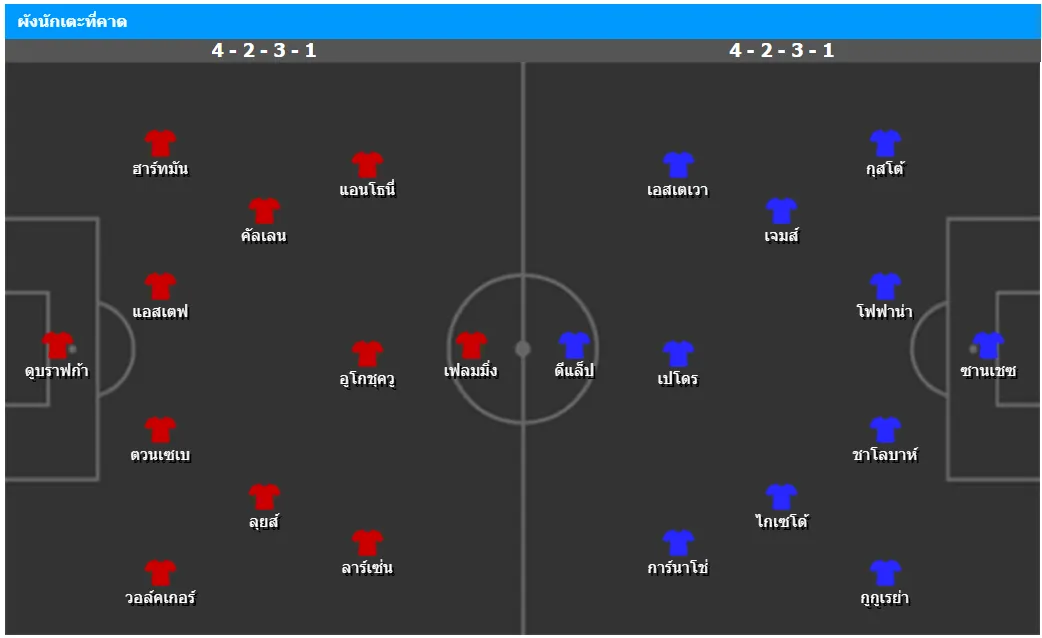 ผู้เล่นคาด: ซานเชซ, กุสโต้, โฟฟาน่า, ชาโลบาห์, กูกูเรย่า – เจมส์ – การ์นาโช่, ดีแล็ป, เปโดร – เอสเตเวา
