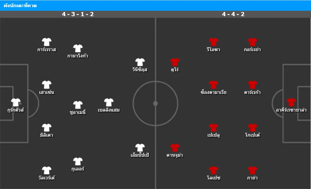 คาดว่าจะใช้ระบบ 4-3-1-2 โดยมี คีลียัน เอ็มบัปเป้ ยืนคู่กับ วินิซิอุส จูเนียร์ และจูด เบลลิงแฮม เป็นตัวเชื่อมเกมรุก