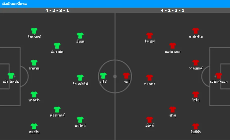 ทีมเยือนมีปัญหาผู้เล่นบาดเจ็บ เช่น เลโอ โรมัน, มาราช กุมบุลล่า และ อันโตนิโอ ลาโต้