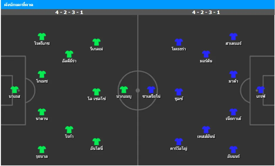 แผนของเปเยกรีนี่น่าจะมาในระบบ 4-2-3-1 โดยใช้ เซดริก บากอมบู ยืนหน้าเป้า มี โล เซลโซ่ เล่นเป็นเพลย์เมกเกอร์ปั้นเกมอยู่ด้านหลัง ขนาบข้างด้วย อันโตนิโอ รีเกลเม่ และ อาโยเซ่ เปเรซ ในแดนกลาง วิลเลียม คาร์วัลโญ่ จับคู่ กีโด้ โรดริเกซ เป็นสองมิดฟิลด์ตัวรับ ส่วนแนวรับมี แชร์กีโอ อากูร์เดล และ เคร์มัน เปซเซลล่า คุมหลังบ้าน