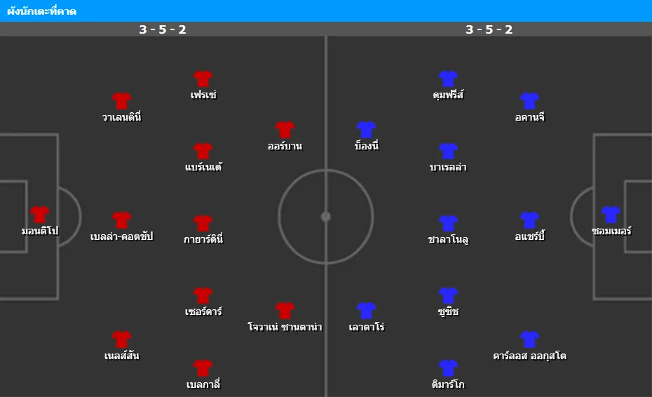 คาดว่าจะมาในระบบ 3-5-2 เน้นรับแน่น มี กิฟต์ ออร์บาน และ ซิโมเน่ แวร์ดิ เป็นคู่หน้า