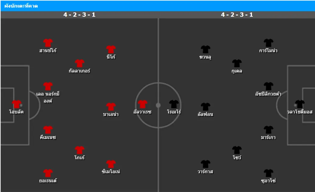 ระบบที่คาดว่าใช้คือ 4-2-3-1 โดยมี อีซัก โรเมโร่ ยืนหน้า พร้อมด้วยผู้ทำเกมรุกอย่าง ฆวนลู ซานเชซ และ รูเบน วาร์กาส