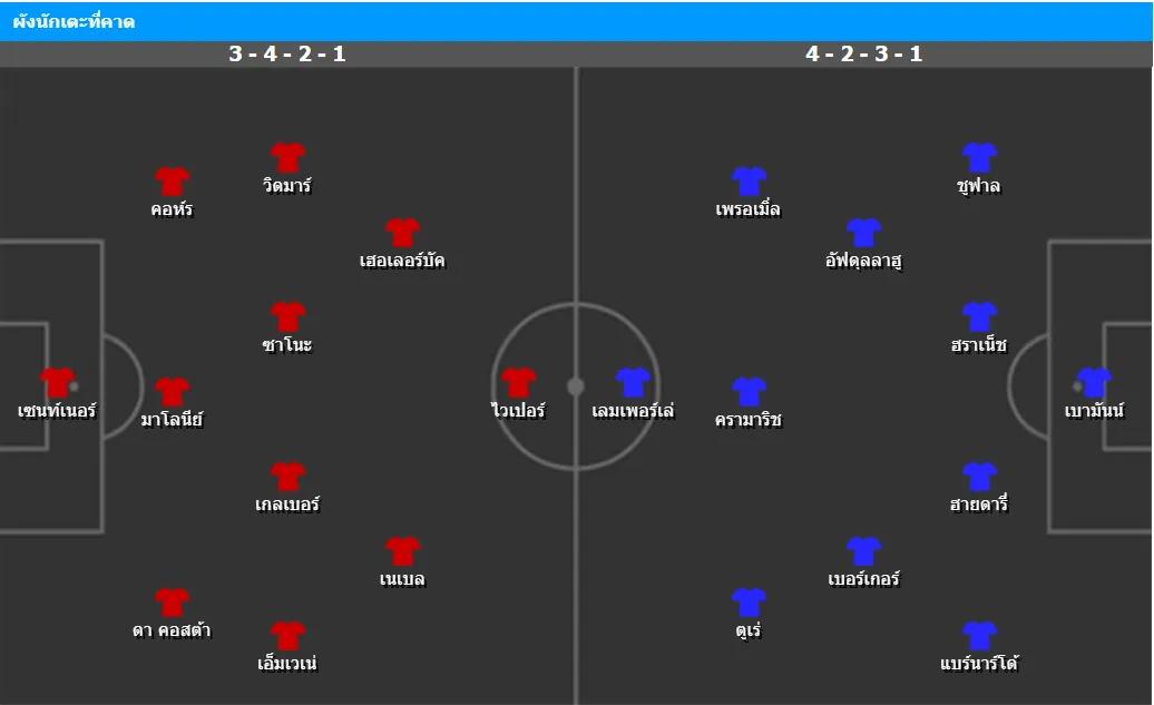 คาดว่าจะใช้ระบบ 3-4-2-1 โดยมีแนวรับ 3 คน เน้นการตั้งรับแล้วรอจังหวะขึ้นเกม ริมเส้นมีบทบาทสำคัญในการเปิดเกมรุก แต่ด้วยการผลิตสกอร์ที่น้อย การเข้าทำไม่หลากหลาย และเกมรับที่ยังพลาดง่าย ทำให้โอกาสชนะลดลง