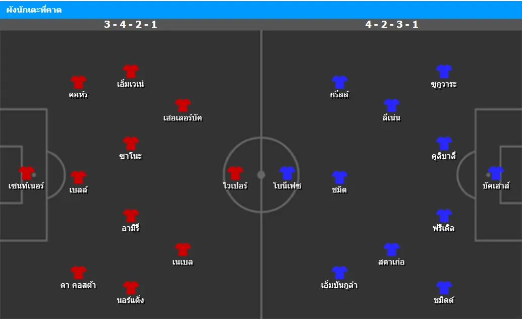 คาดว่าในแมตช์นี้จะจัดระบบ 3-4-2-1 เพื่อเพิ่มความแน่นในแดนกลางและหวังใช้เกมริมเส้น