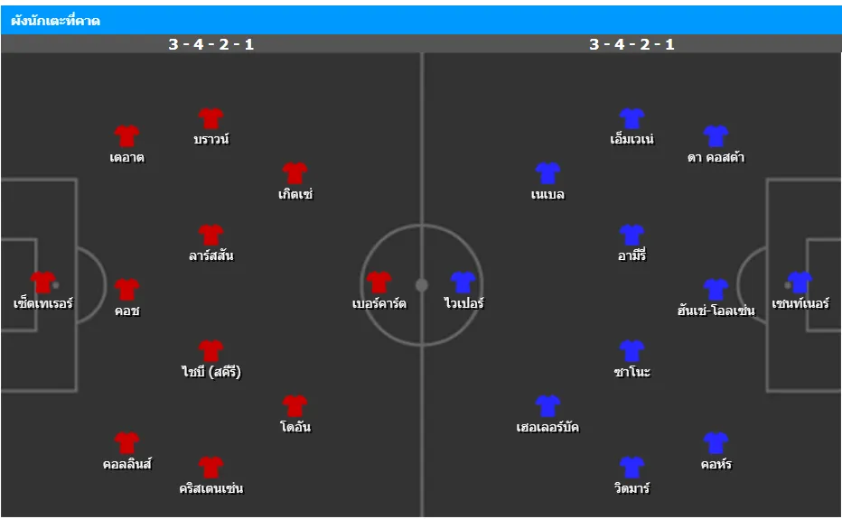 ไอน์ทรัค แฟร้งค์เฟิร์ต (3-4-2-1): มิชาเอล เซ็ตเทเรอร์ – เอ็นนัมดี้ คอลลินส์, โรบิน คอช, อาร์ตูร์ เตอาต – ราสมุส คริสเตนเซ่น, เอลลีเยส สคิรี, อูโก้ ลาร์สสัน, เนธาเนียล บราวน์ – ริทสึ โดอัน, มาริโอ เกิตเซ่ – โยนาธาน เบอร์คาร์ต